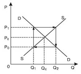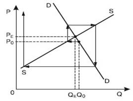 Рис. 10.4. Кривая предложения для отрасли с различной комбинацией процессов Стабильность равновесия – это способность рынка, выведенного из равновесного состояния, вновь возвратиться к равновесному состоянию под воздействием только внутренних сил. В том случае, когда равновесие имеет свойство стабильности, дополнительное регулирование рынка не обязательно. Когда равновесие не имеет свойства стабильности, то регулирование рынка является обязательным. Если линии спроса и предложения имеют нормальный (соответственно отрицательный и положительный) наклон, то равновесие стабильно. Траектория движения возвращения в состояние равновесия отражается с помощью паутинообразной модели, которая отражает запаздывание реакции предложения или спроса. Паутинообразная модель описывает динамический процесс: траекторию корректировки цен и объема производства при движении от одного состояния равновесия к другому, используется для описания колебаний цен на рынках сельскохозяйственной продукци и, на биржевом рынке, где предложение реагирует на изменения цен с некоторым запозданием. Рассмотрим вариант динамической модели рынка одного продукта. Предположим, что объем спроса зависит от уровня цен текущего периода, а объем предложения – от уровня цен предшествующего периода: QiD = QiD(Pt) и QiS = QiS(Pt-i) где t – определенный период (t = 0, 1, 2,... Т). Это значит, что производители в период t – 1 определяют объем производства, предполагая, что цены периода t – 1 сохраняются и в период t (Pt-i = Pt). В таком случае график спроса и предложения будет иметь вид паутинообразной модели.