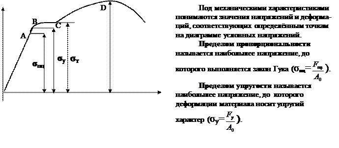 Пределом текучести (физическим) называется напряжение, при котором деформации растут без заметного увеличения нагрузки (σт= Для материалов, не имеющих площадки текучести определяется условный предел текучести σ0,2 – это напряжение, при котором остаточные деформации составляют 0,2% первоначальной длины. Пределом прочности, или временным сопротивлением называется максимальное напряжение, которое материал выдерживает без разрушения ( σв= Основные механические характеристики материалов, применяемых в технике, приводятся в справочной литературе.