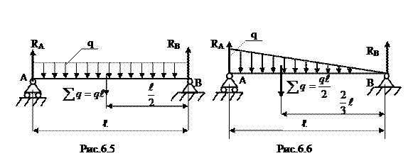 Определение опорных реакций изучается в теоретической механике. Поэтому рассмотрим только некоторые практические вопросы. Опоры балок обычно обозначаются буквами, например, А, В, С, показывается Если на балку действует распределённая нагрузка, то она заменяется равнодействую-щей (Σq), величина которой находится как площадь грузовой эпюры, прикладывается она в центре тяжести этой эпюры. В качестве примера рассмотрим равномерно распределённую нагрузку и нагрузку, изменяющаяся по линейному закону. Грузовые эпюры этих нагрузок представляет собой соответственно прямоугольник и прямоугольный треугольник Их равнодействующие и точки приложения показаны на рисунках (6.5) и (6.6).