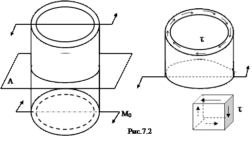 В качестве примера такого напряженного состояния можно рассмотреть тонкостенную цилиндрическую трубку, нагруженную по торцам парами сил (рис.7.2). Рассечем её плоскостью А, отбросим верхнюю часть и покажем оставшуюся нижнюю часть. В сечении действуют касательные напряжения τ, величина которых определится из условия равенства момента равномерно распределенных по сечению внутренних сил внешнему моменту М0: Нормальных напряжений в этом сечении не будет. Вырежем из стенки бесконечно малый элемент в виде кубика. На его нижней грани будут действовать касательные напряжения такие же, как и на верхней, но в противоположном направлении. На передней и задней стенках напряжений нет. Так как элемент должен находиться в равновесии, то на боковых стенках также должны быть касательные напряжения, которые создают пару сил, но направленную в противоположную сторону. При чистом сдвиге длины ребер элементарного параллелепипеда не изменяются, а изменяются углы между гранями (рис. 7.3). Верхняя грань параллелепипеда перемещается относительно противоположной грани на величину δ, называемую абсолютным сдвигом.