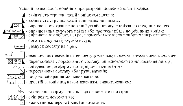 Розробка графічної моделі станції і розрахунок основних показників її роботи До вихідних даних для побудови добового плану-графіка відноситься: - норми часу на виконання всіх операцій по розформуванню-формуванню составів; - подавання-забирання місцевих і інших вагонів; - навантаження-розвантаження на пунктах місцевої роботи; - обробка поїздів всіх категорій і у всіх парках станції; - час заняття всіх елементів станції операціями по прийому, відправленню поїздів, пропуску локомотивів, подаванню-забиранню вагонів. На спеціальній сітці з десятихвилинними інтервалами часу за допомогою горизонтальних ліній наносяться прилягаючі до станції перегони, станційні парки й окремі колії, найбільш завантажені групи стрілочних переводів, насувні колії гірок, вантажні облаштованості, маневрові витяжки; показується зайнятість усіх працюючих на станції локомотивів. Розміщення цих елементів станції на сітці повинно бути таким, щоб більш повно забезпечувалася технологічна потоковість і послідовність виконання операцій із вагонами. Добовий план-графік будувати й аналізувати легше, якщо зверху вниз показується просування потоку послідовно: перегони, парк прийому, гірка і та ін. Якщо переробка в обох напрямках однакова, то непарний потік проходить через графік зверху вниз, а парний - знизу вгору У цьому випадку на сітку наносяться: перегони прийому непарних і відправлення парних поїздів (ширина смуги 20-25мм.), стрілки вхідної (вихідної) горловини (по 5мм. на кожну групу), колії парку (по 10мм. на колію), гірка (10мм. на кожну насувну колію), роботу гіркових локомотивів та локомотивів витяжок (10мм.), колії сортувального парку (25мм.) із вказівкою їхньої спеціалізації, маневрові витяжки (10мм.), пункти місцевої роботи (по 10-15мм), парний приймально-відправний парк (аналогічно парку прийому стрілки, колії), парк відправлення (стрілки центральної горловини, колії, стрілки вихідної горловини), перегони прийому парних і відправлення непарних поїздів. Ширина смуг може бути іншою у залежності від кількості колій, конструкції горловин тощо. При значних розмірах роботи, перегони “прийом поїздів” і “відправлення” можуть показуватися роздільно.
