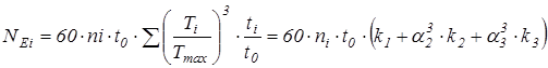 ¨ Определение эквивалентного числа циклов нагружения при расчете на контактную прочность шестерни и колеса. При расчете зубчатых передач, работающих в условиях переменных режимов нагрузки, за расчетную принимают максимальную рабочую нагрузку, а переменность нагрузки учитывают введением в формулу для определения допускаемых напряжений эквивалентного числа циклов нагружения. Эквивалентным называют некоторое расчетное число циклов, которое при действии постоянной нагрузки, равной максимальной нагрузке рассчитываемой передачи, дало бы тот же эффект по пределу выносливости рабочих поверхностей зубьев, который дает в течение фактического числа циклов действительная переменная нагрузка передачи. Эквивалентное число циклов найдем по формуле.