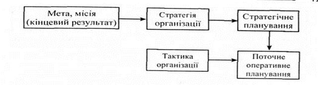 Рис. 1.10. Процес планування від мети організації до поточного планування Організаційна функція - це організація процесу управління, вжиття усвідомлених необхідних заходів і дій. Завданням цієї функції є створення структури організації, а також забезпечення всім необхідним для її ефективної діяльності, досягнення запланованих цілей. Після визначення мети і вибору стратегії розпочинають проектування або планування структури організації. Процес проектування має здійснюватися зверху вниз, тобто розподіл організації на широкі сфери, після цього розподіл цих сфер на більш вузькі сфери і подальший розподіл останніх на складові вузькоспеціалізовані елементи. Послідовність дій у плануванні структури організації така: 1. Здійснити розподіл організації по горизонталі на широкі блоки, що відповідають найважливішим напрямам діяльності з реалізації стратегії. 2. Встановити співвідношення повноважень різних посад. При цьому керівництво встановлює мету команд, якщо необхідно, проводить подальший розподіл на більш дрібні організаційні підрозділи, щоб ефективніше використовувати спеціалізацію і уникнути перевантаження керівництва. 3. Визначити посадові обов'язки як сукупність певних завдань та функцій і доручити їх виконання конкретним особам. В організаціях, діяльність яких значною мірою пов'язана з технологією керівництва, розробляти навіть конкретні завдання і закріплювати їх за безпосередніми виконавцями, які й несуть відповідальність за їх задовільне виконання. Організаційна функція менеджменту - це процес проектування і створення двох структур: управлінської і виробничої. Ці структури тісно взаємопов'язані. Структура управління повинна забезпечувати процес управління, координувати контроль в організації. Виробнича структура має забезпечити процес виробництва (технологія, обладнання, люди відповідної кваліфікації) в об'ємі планових завдань при дотриманні запланованої якості робіт. Структура організації має відповідати її меті і стратегічним планам, забезпечувати ефективну взаємодію організації з навколишнім середовищем. Функція мотивації - це процес спонукання працівників, трудового колективу до активності і підвищення продуктивності праці заради досягнення визначеної мети через стимулювання особистих і колективних інтересів. Процес спонукання (активізації) містить: формування цілей організації, спрямованих на додаткове задоволення потреб (матеріальних чи духовних) її працівників; визначення сукупності потреб, які потрібно задовольнити, а також активних дій, необхідних для задоволення потреб працівників. Досвід засвідчив, що робітники будь-якої організації працюють ефективно тільки в тому випадку, коли вони знають, за що працюють і які їхні потреби будуть задоволені. Задоволення потреб працівників є нагородою або платою за працю. Додаткове задоволення потреб людини, здатних спонукати її до високоефективної діяльності, є мотивацією. Мотивацію можна також визначити як дію на психологію людини, внаслідок якої у неї виникає бажання продуктивно працювати. Такими чинниками дії є: - заробітна плата; - матеріальна винагорода; - матеріальні стимули; - моральні стимули; - інші. Сучасні теорії мотивації (А. Маслоу, Д. Мак Клелланда, Ф. Герцбега) роблять основний наголос на потреби людини, їх перелік і структуру. 