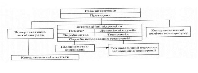 Поточне керівництво здійснює президент, який очолює орган управління, що працює над питаннями фінансування, координації діяльності. При раді директорів може функціонувати консультативна технічна рада для розробки рекомендацій президенту щодо визначення тематики досліджень, яка також виявляє нагальні проблеми. Організаційна структура консорціуму, спрямованого на науково-пошукову діяльність, може бути різною (рис. 4.9).