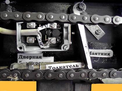 Толкатель, установленный на ведомойстворке, нажимает на маятник, заставляя его отклониться вправо (см. фото). В результате стержень дверной блокировки под действием своей пружины перемещается вместе с контактными мостиками также вправо, замыкая контакты БД, находящиеся в проводе Д4 низковольтной вспомогательной цепи.