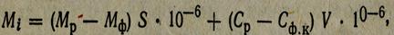 де Мі — маса нафти (нафтопродуктів), яка потрапила у воду, т; Мр—маса нафти (нафтопродуктів), розлитої на 1 м2 поверхні води, т; Мф — маса нафти на 1 м2 поверхні води, що має природне походження; S —площа розливу нафти, м2; 10-6 — коефіцієнт, який враховує розмірність величин; Ср — концентрація розчиненої у водінафти на глибині п, г/м3; Сф.к — фонова концентрація розчиненої у воді нафти, г/м3; V — об'єм забрудненої води, м3, що визначається за формулою