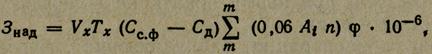 де Vх — витрати зворотних вод, м3/год; Тх — тривалість наднормативного скиду, год; Сс.ф - середня фактична концентрація забруднюючих речовин у зворотних водах, г/м3; Сд — дозволена до скиду концентрація забруднюючих речовин, яку визначено при затвердженні ГДС, г/м3. У разі скиду речовин, які відсутні в переліку допустимих до скиду, а фактична концентрація їх перевищує гранично допустимі концентрації (ГДК) для водного об'єкта, що приймає зворотні води, в розрахунковій формулі Сд приймається рівним ГДК; 0,06 — коефіцієнт відшкодування збитків як частка мінімальної заробітної плати, що припадає на знешкодження забруднення 1 м3 водного прошарку, Аі — показник відносної небезпечності речовини, визначається із співвідношення 1/Сгдк, де Сгдк — гранично допустима концентрація цієї речовини згідно з Санітарними правилами і нормами або Узагальненим переліком ГДК шкідливих речовин для води рибогосподарських водойм; n — величина мінімальної заробітної плати, грн, φ — коефіцієнт, який враховує категорію водного об'єкта: морські та поверхневі водні об'єкти комунально-побутового водокористування — 1,0; поверхневі водні об'єкти господарсько-питного водокористування — 1,4, поверхневі та морські водні об'єкти рибогосподарського водокористування II категорії— 1,6, І категорії — 2,0; 10-6 — коефіцієнт, який враховує розмірність величин. Збитки для самовільних, аварійних та санкціонованих вимушених скидів зворотних вод визначають за формулою