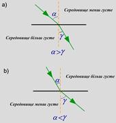 5 ПОВНЕ ВНУТРІШНЄ ВІДБИВАННЯ. Якщо перше середовище оптично густіше за друге, то при поступовому збільшенні а заломлений промінь, «опускаючись», наближається до межі поділу середовищ. При деякому значенні