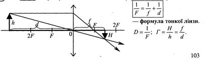 [D] = 1/м = 1 дптр. Оптична сила лінзи дорівнює одній діоптрії, якщо її фокусна відстань дорівнює одному метру. Головна цінність лінзи полягає в тому, що а її допомогою можна отримати зображення предметів, які можуть світитись самі чи світяться відбитим світлом. Формула тонкої лінзи: