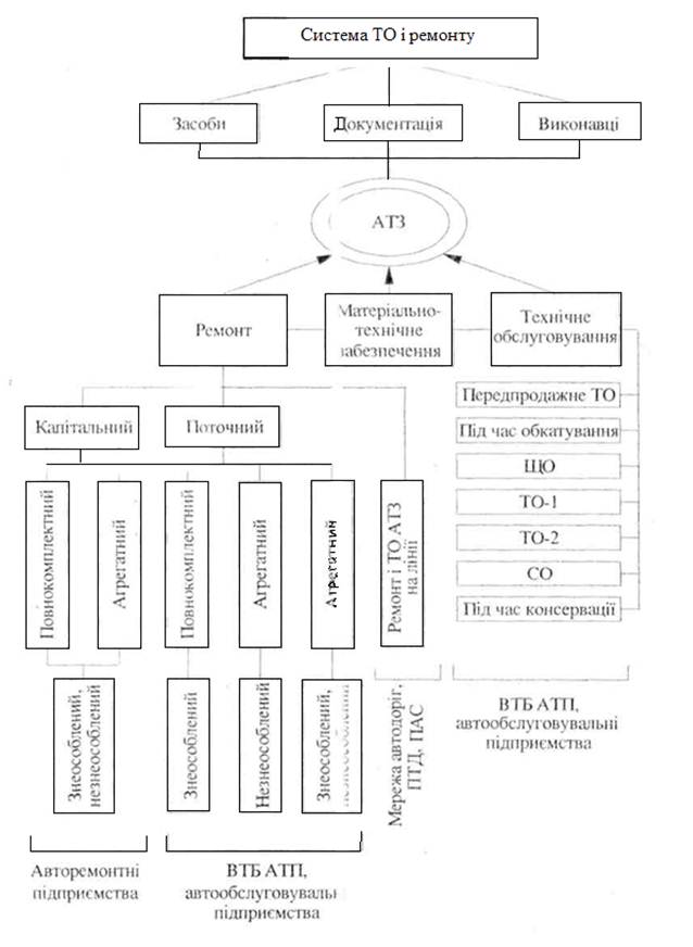 Зміст лекції 4.1 Загальні положення. На автомобільному транспорті прийнята планово-запобіжна система ТО і ремонту рухомого складу. Принципові її основи визначені чинним Положенням про ТО і ремонт дорожніх транспортних засобів автомобільного транспорту. Відповідно до Статуту автомобільного транспорту Положення обов'язкове для всіх організацій і підприємств автомобільного транспорту, для організацій і підприємств автомобільної і суміжних галузей промисловості щодо забезпечення встановлених нормативів і взаємодії з експлуатаційними та ремонтними організаціями і підприємствами автомобільного транспорту. У Положенні визначено основні напрями взаємодії, завдання і відповідальність організацій і підприємств автомобільного транспорту, промисловості й авторемонтного виробництва щодо забезпечення високої надійності рухомого складу і зниження витрат на ТО ремонт. Наприклад, одним із завдань автомобільної промисловості є безпосередня участь в освоєнні нових моделей. Промислові підприємства повинні вчасно забезпечити автотранспортні й авторемонтні підприємства технічною документацією, зразками не-стандартизованого устаткування, оснастки, спеціального інструменту, запасними частинами й експлуатаційними матеріалами потрібними для організації ТО і ремонту; сприяти в організації капітального ремонту автомобілів на промисловій основі, а також відновлювати деталі як товарну продукцію та інше. Це Положення визначає порядок проведення технічного обслуговування і ремонту дорожніх транспортних засобів і поширюється на юридичних та фізичних осіб - суб'єктів підприємницької діяльності, які здійснюють експлуатацію, технічне обслуговування і ремонт дорожніх транспортних засобів (за винятком тролейбусів, мопедів і мотоциклів) незалежно від форм власності. Мета технічного обслуговування і ремонту - підтримування дорожніх транспортних засобів у технічно справному стані та належному зовнішньому вигляді, забезпечення надійності, економічності, безпеки руху та екологічної безпеки. За цим Положенням терміни, наведені нижче, вживаються в такому значенні: дорожній транспортний засіб (ДТЗ) - транспортний засіб, призначений для експлуатації переважно на автомобільних дорогах загального користування усіх категорій і сконструйований згідноз їхніми нормами; технічне обслуговування (ТО) - комплекс операцій чи операція щодо підтримки працездатності або справності транспортного засобу під час використання за призначенням, зберігання та транспортування; система технічного обслуговування та ремонту техніки - сукупність взаємопов'язаних засобів, документації технічного обслуговування і ремонту та виконавців, які потрібні для підтримуваня і відновлення якості виробів, що входять у цю систему; періодичність технічного обслуговування (ремонту) - інтервал часу чи напрацювання між даним видом технічного обслуговування (ремонту) і наступним таким же видом або іншим, більшої складності; напрацювання - тривалість або обсяг роботи виробу. Напрацювання може підготовка до продажу - комплекс операцій чи операція щодо виявлення та усунення усіх несправностей, як виникали в процесі транспортування і зберігання ДТЗ та підготовки їх до використання; сезонне технічне обслуговування - технічне обслуговування, яке виконується для п