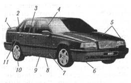 Рис. 11.12. Схема антикорозійного оброблення автомобіля: 1 — багажник; 2 — замки, петлі, шарніри; 3 — внутрішні двері; 4 — стояки; 5 — зварні шви піл капотом; 6 — днище; 7— усередині салону під килимком; 8 — пороги всередині, лонжерони; 9—пороги зовні: 10— диски коліс; 11 — арки коліс Для антикорозійного оброблення кузовів (рис. 11.12) використовують воскопо-дібні матеріали Тесtуl, Noхudol, нафтопродукти «Мовіль», НГМ-МЛ тощо (табл. 11.1). Перед нанесенням захисного матеріалу автомобіль треба помити, просушити (особливо закриті частини кузова), зняти колеса, потім обробляти. Оброблення: всі позначені на спеціальній карті-схемі закриті порожнини, пороги, лонжерони, двері, траверси, стояки, зварні шви під капотом і кришкою багажника покривають воскоподібним матеріалом Noхudol 750 (Noхudol 700) за допомогою насоса 1: 3 повітряного розпилення зі спеціальними насадками. Днище автомобіля обробляють густим зі спеціальними наповнювачами і присадками матеріалом Noхudol 900 (Noхudol Вrоnzе, Noхudol 300 Вrоnzе) за допомогою насоса високого безповітряного розпилення 1:26. Контроль і миття: після того як усі зазначені в карті-схемі місця оброблено, автомобіль миють, проводять приймальний контроль, кріплять наклейку про оброблення. Таблиця 11.1. Антикорозійне оброблення автомобіля