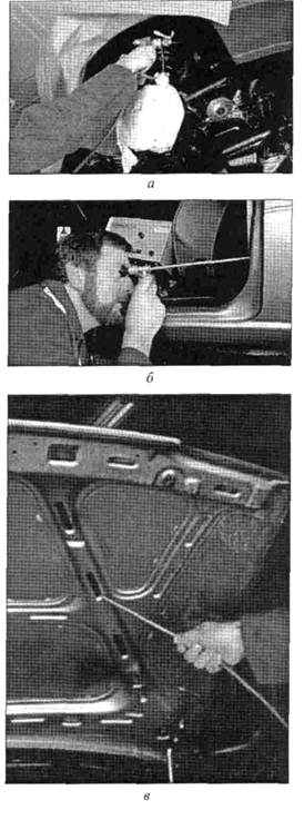 Рис. 11.14. Технологія нанесення антикору Тесtуl Вгоnzе: а — оброблення прихованих порожнин автомобіля під тиском; б — перевірка якості нанесення антикору ендоскопом; в — безповітряне оброблення кришки багажника автомобіля; г — нанесення антикору під високим тиском у порожнину кузова