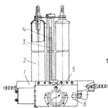 Рис. 8.1. Схема витратоміра НИИАТ-ЛО-12 Час витрати палива вимірюється автоматично секундоміром 5. При проходженні автомобілем мірної ділянки перемикач забезпечує одночасне включення (виключення) секундомірів і подачу (припинення подачі) палива з мірних циліндрів приладу. Положення перемикача визначає порядок роботи електромагнітних клапанів, а також тривалість замкнутого стану їхніх контактів. Для підведення і відведення палива прилад з'єднують з бензонасосом і карбюратором за допомогою металевих трубопроводів або бензостійких шлангів. Для контролю витрати палива дизельних двигунів у НИИАТ розроблено спеціальний витратомір, який відрізняється від розглянутого додатковим клапаном, що керує напрямом руху палива в системі паливоподачі. 4 Діагностування двигуна за шумами і вібраціями.