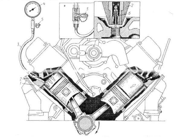 Рис. 8.2. Схема перевірки компресії: 1 – головка циліндра; 2 – гумовий наконечник; 3 – шланг; 4 – манометр; 5 – клапан випуску повітря; 6 - золотник Діагностування за виходом стиснутого повітря. Причини спаду компресії можна визначити за виходом стиснутого повітря, яке подається в циліндр двигуна через отвір для свічки: якщо стиснуте повітря виходить через карбюратор або глушитель, то клапани нещільно прилягають до сідел; якщо через сапун, то не справна (спрацьована) циліндропоршнева група; якщо стиснуте повітря потрапляє в сусідній циліндр з охолодженою рідиною, то пошкоджена прокладка головки блока. Витікання стиснутого повітря з циліндра точніше можна визначити за допомогою спеціального переносного приладу (рис. 8.3), який дає змогу визначити технічний стан циліндрів, поршневих кілець, клапанів і прокладок головок блока циліндрів. За допомогою цього приладу по черзі впускають стиснуте повітря в циліндри через отвори для свічок запалювання або форсунки при непрацюючому двигуні в положенні, коли клапани закриті, і при цьому вимірюють вихід повітря за показаннями манометра приладу.