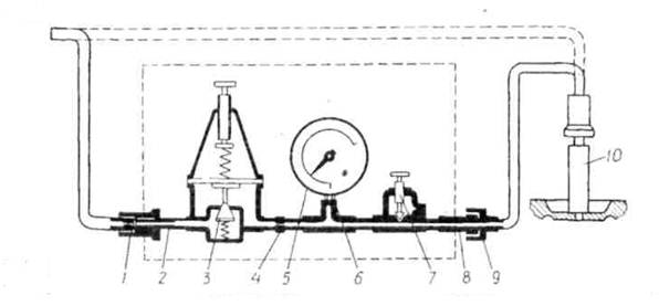 Рис. 8.3. Прилад К-69М: 1 – муфта швидко знімна; 2 – штуцер вхідний; 3 – редуктор; 4 – сопло вхідне; 5 – манометр вимірювальний; 6 – демпфер; 7 – гвинт регулювальний; 8 – штуцер вихідний; 9 – сполучна муфта; 10 – штуцер.