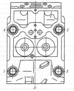 Зміст лекції У процесі роботи двигуна кріплення головки блока циліндрів ослаблюються внаслідок деякого осідання прокладки і здовження болтів 1—4 (шпильок). Починати кріпити головку блока циліндрів треба з середніх гайок (болтів), поступово переходити до крайніх у певній послідовності (рис. 13-10). Болти (гайки) затягують у два прийоми: попередньо й остаточно. Ступінь затягнення забезпечується динамометричною рукояткою відповідно до заводських вказівок щодо обслуговування автомобілів. Гайки (болти) кріплення чавунної головки блока підтягують на підігрітому двигуні, а з алюмінієвих сплавів — на холодному. Це пояснюється тим, що затягнення гайок на гарячому двигуні після його остигання виявиться недостатнім унаслідок того, що головка блока з алюмінієвих сплавів стискується більше, ніж сталеві шпилькі. Недостатнє і неправильне затягування призводить до руйнування прокладки головки блока, деформування головки, порушення герметичності камери згоряння.