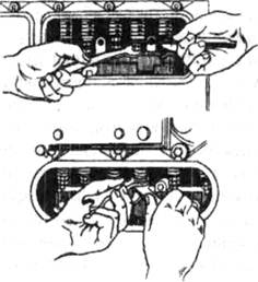 Рис. 13.10. Порядок затягування болтів кріплення головки блока циліндрів двигуна КамАЗ-740: I, II — сторони впуску і випуску відповідно. 1.2 Регулювання теплових зазорів клапанів. Теплові зазори збільшуються внаслідок спрацювання кулачків і штовхачів, клапанів і коромисел. Збільшення зазору призводить до збільшення шуму в клапанному механізмі, втрати потужності, а зменшення — до обгоряння сідел і клапанів, «чхання» в карбюраторі, «пострілів» у глушителі, зменшення потужності, збільшення спрацювання циліндрів. Регулювання зазорів (рис. 1 а, б) — трудомістка операція, оскільки на багатьох автомобілях треба виконувати додатково демонтажі роботи. Тепловий зазор вимірюють щупом. Розмір зазорів зазначають в інструкціях автомобільних заводів. Теплові зазори регулюють при повністю закритих клапанах, починаючи з першого циліндра, а потім у послідовності, що відповідає порядку роботи двигуна. Зазор змінюють до потрібної величини, обертаючи регулювальний болт штовхача або гвинта коромисла.