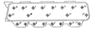 Заміна поршневих кілець. Після того, як прийняте рішення про необхідність заміни поршневих кілець, двигун треба розібрати, не знімаючи його з автомобіля, у такій послідовності: злити рідину із системи охолодження двигуна; від'єднати від головки циліндрів усі трубопроводи, захистити їхні внутрішні порожнини від попадання пилюки і бруду; зняти кришку головки циліндрів; зняти коромисла разом з осями і вийняти штанги; послабити гайки кріплення головки циліндрів, дотримуючи ту ж послідовність, що і при затягуванні, потім вивернути їх (рис. 8.5) зняти головку циліндрів з двигуна; зняти обережно прокладку головки циліндрів; зняти піддон картера; вивернути болти і зняти кришки нижніх головок шатунів; вийняти поршень у зборі з шатуном із гільзи.