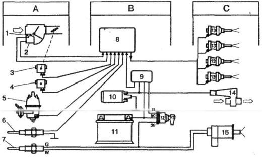 Рис. 11.2 - Функціональна схема управління системою упорскування "L-Jetronic": А - пристрій вхідних параметрів: 1 - датчик температури всмоктування повітря, 2 -витратомір повітря, 3 - вимикач положення дросельної заслінки, 4 - висотний коректор, 5 датчик-розподільник запалювання, б - датчик температури охолоджуючої рідини, 7 - термореле. В - пристрої керування й забезпечення: 8 - електронний блок управління, 9 - блок реле, 10 - паливний насос, 11 - акумуляторна батарея, 12 - вимикач запалювання. С - пристрої вихідних параметрів: 13 - робочі форсунки, 14 - клапан додаткового повітря, 15 - пускова форсунка Регулятор тиску палива. Манометр під'єднують до вхідного патрубка регулятора. Включають паливний насос і по манометру визначають тиск палива. Далі від'єднують від регулятора тиску вакуумний шланг і приєднують до патрубка регулятора ручний вакуумний насос, за допомогою якого створюють в регуляторі розрідження 0,5 кгс/см2. При цьому тиск палива повинно знизитися на ту ж величину. Потенціометр витратоміра повітря. Від'єднавши від витратоміра трубопровід підведення повітря, переміщають напірний диск потенціометра і вимірюють опір потенціометра, який повиннен знаходитися в межах 60-1000 Ом. Якщо результат вимірювання виходить за вказані межі, витратомір повітря замінюють. Датчик температури повітря на впуску. Датчик температури вбудований в витратомір повітря. Для перевірки справності вимірюють його опір, який залежить від температури повітря: -10°С - в межах 8-10 кОм; 20°С - 2-3 кОм; 80°С - 0,30-0,37 кОм. Пускова форсунка. Від'єднайте колодку від пускової форсунки, зніміть пускову форсунку, відвернувши кріплять гайки. Підключіть паливний насос до джерела живлення. Перевірте герметичність форсунки: при тиску палива в системі 3 кгс/см2 з розпилювача форсунки повинно витекти не більше 0,3 смЗ палива за 1 хв. Закріпіть пускову форсунку над мензуркою і включіть її. Перевірте кут конуса розпилення палива і продуктивність форсунки, які повинні бути відповідно близько 80° і 93 ± 11 см/хв при тиску палива в системі 3,0 кгс/см2 і 85 ± 10 см/хв при тиску палива 2,5 кгс/см2. Опір обмотки пускової форсунки при 20°С - 3-5 Ом. Перевірка робочих форсунок. Від’єднайте колодки від форсунок, включіть запалення, вольтметром перевірте напругу на обох контактах колодки. Електропроводка і електронний блок управління справні, якщо вольтметр показує однакову напругу на всіх контактах. Перевірку періодичності уприскування можна провести наступним чином. Зніміть робочі форсунки (проводи, топлівопроводи під'єднані). Заглушите паливопровід, що йде до пускової форсунки. Від'єднайте провід від розподільника запалювання. Увімкніть стартер. Форсунки повинні впорскувати паливо через рівні проміжки часу всі одночасно. Перевірку герметичності робочих форсунок проводите так. Від'єднайте розподільну магістраль (кріпиться двома болтами) і підніміть її до виходу форсунок з гнізд у впускному колекторі. Розподільна магістраль у зборі з форсунками і з регулятором тиску палива в системі закріплюється на капоті. Колодки підведення електроживлення до форсунок при цьому від'єднані. При тиску палива в системі 2,5 кгс/см2 з форсунок повинно з’являтись не більше однієї краплі палива в хвилину. Для перевірки продуктивності робочих форсунок поставте під форсунки мензурки та увімкніть їх безпосередньо. Перевірте кут конуса розпи