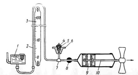 Рис. 12.4. Установка для перевірки герметичності голчастого клапана: 1 - бачок; 2 - трубка; 3 - шкала; 4 - клапан; 5,6 - корпус; 7 - трійник; 8 - краник; 9 - поршень; 10 - шток