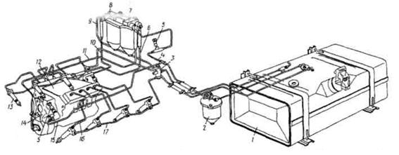 Рис. 13.1. Система живлення двигуна: 1 - паливний бак; 2 - фільтр грубої очистки палива; 3 - трійник дренажних паливопроводів; 4 - підвідний паливопровід до паливо-підкачувального насоса; 5 - паливопідкачувальний насос; 6 - підвідний паливопровід до паливного насоса високого тиску; 7 - фільтр тонкої очистки палива; 8 - пробка-заглушка; 9...10 - відвідні паливопроводи від паливного насоса високого тиску; 11 - підвідний паливопровід до фільтра тонкої очистки палива; 12 - паливний насос високого тиску; 13 - форсунка; 14 - паливний насос; 15 - підвідний паливопровід до насоса низького тиску; 16 - паливопровід високого тиску; 17 - дренажний паливопровід лівого ряду форсунок
