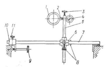 Рис. 17.1. Прилад для перевірки биття карданного вала: 1 - карданний вал; 2 - наконечник індикатора; 3 - гвинт кріплення індикатора; 4 - індикатор; 5 - штанга вертикальна; 6 - хрестовина; 7 - штанга горизонтальна; 8 - гвинти затискні; 9 - гвинт розпірний; 10 – опора пересувна; 11 - гвинт стопорний Спрацювання в шарнірах і шліцьових з'єднаннях визначають візуально за їхнім відносним зміщенням під час похитування вручну. При різкому повороті вала в обидва боки не повинно бути стукоту й відчутного люфту. Особливу увагу при обслуговуванні карданної передачі приділяють перевірці і підтяганню кріпильних з'єднань. Момент затяжки кожного болта має бути 80...200 Н·м. На ресурс карданних шарнірів і підшипників ведучого вала головної передачі дуже впливає балансування карданного вала. Тому, щоб вберегти заводське балансування карданної передачі, після розбирання її треба складати за встановленими стрілками. 17.2 Поточний ремонт карданної передачі. Карданну передачу необхідно направляти в ремонт при появі вібрацій на визначених швидкостях руху і стукоту при зрушенні і розгоні автомобіля. Несправність може виникнути при ослабленні затягування болтових з’єднань фланців карданних валів. Тому попередньо перевіряють затягування болтів кріплення фланців карданів. Переконавшись у наявності дефектів карданної передачі, її розбирають, від'єднуючи передній вал від заднього і знявши проміжну опору. Потім із заднього карданного вала знімають гумову захисну муфту, корпус, сальник і виймають ковзну вилку вала. Найбільш поширеними дефектами деталей карданної передачі є такі: знос зовнішніх і внутрішніх шліцьових поверхонь переднього і заднього валів, ковзної вилки і фланця кріплення переднього вала, знос робочих поверхонь шипів хрестовини карданів, знос голчастих підшипників і гнізд під підшипники у фланцях карданних валів, вм'ятини, погнутості, тріщини, відколи і скручування карданних труб, фланців і ковзних вилок, знос вузла проміжної опори, знос і ушкодження захисного чохла, буферів, подушок і сполучних болтів двох валів. Карданну передачу розбирають на спеціальному стенді. При складанні карданних валів варто пам'ятати, що вилки кардана повинні легко, без заїдання повертатися на хрестовині. Якщо після затягування болтів кришок підшипників вилки не повертаються або для цього потрібно докласти велике зусилля, необхідно підібрати хрестовину з меншою відстанню між торцями протилежних шипів. При складанні карданних валів варто пам'ятати, що завод-виробник після балансування карданного вала наносить мітки у вигляді стрілок. Тому при складанні деталей, що були в експлуатації, необхідно сполучити стрілки на ковзній вилці і трубі карданного вала. Примітка: Перелік основних робіт по ТО карданної передачі наведено в лекції №15.