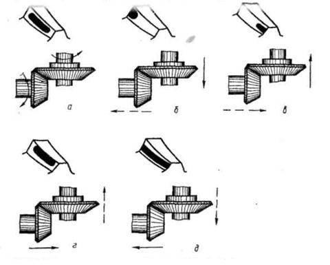 Рис. 17.2. Регулювання зчеплення конічних шестерень головної передачі Коли ж пляма контакту розташовується так, як на рис 11.15, д, то необхідно відсунути ведучу шестірню від ведомої. Якщо бічний зазор між зубцями буде занадто великий, потрібно присунути ведену шестірню. У процесі регулювання зчеплення шестерень, регулювальні прокладки можна тільки переміщати з-під одного гнізда підшипника веденої конічної шестерні під друге. Після остаточного регулювання зчеплення конічних шестерень затягують болти кріплення гнізд підшипників ведучої циліндричної шестірні і кришку переднього підшипника вала ведучої конічної шестірні. Примітка: Роботи по ТО задніх мостів наведені в лекції №15.