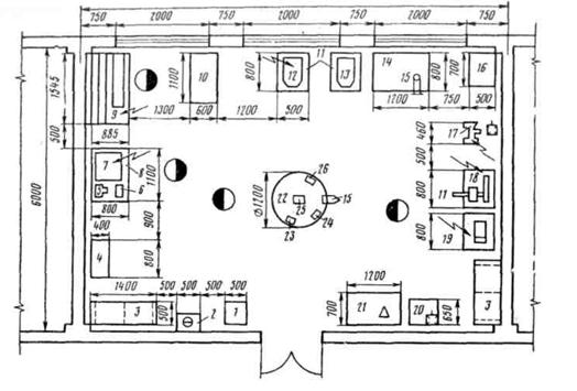 Рис. 38.4. Технологічне планування електротехнічного відділення (типовий проект): 1 - скринька; 2 - умивальник; 3 - стелаж; 4 - сринька для обтиральних матеріалів; 5 - прилад для перевірки запальних свічок; 6 - прилад для перевірки щитових контрольно-вимірювальних приладів; 7 - прилад для перевірки приладів системи запалювання; 8 - стіл для приладів; 9 - універсальний стенд контрольно-вимірювальний; 10 - конторський стіл; 11 - підставка під обладнання; 12 - верстак свердлильний; 13 - ручний прес; 14 - верстак слюсарний; 15 - тиски; 16 - тумбочка; 17 - електроточило; 18 - верстак для проточування колекторів; 19 - токарний верстак (настільний); 20 - шафа сушильна; 21 - установка для розбирання, миття й обдування деталей; 22 - стіл електрика; 23 - прилад для ремонту генераторів і стартерів; 24 - прилад для розбирання генераторів; 25 - поличка для інструментів; 26 - прилад для перевірки якорів генераторів