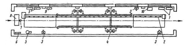 Рис. 38.12. Схема типового планування лінії ЩО вантажних автомобілів на три пости: 1, 2 - скринька для обтиральних матеріалів, конвеєр; 3 - барабан зі шлангом для води; 4 - мийна машина; 5 - пилосос; 6 - щит інвентарний; 7 - монорейковий електротельфер; 8 - контейнер; 9 - пульт управління; 10 - установка для миття обтиральних матеріалів