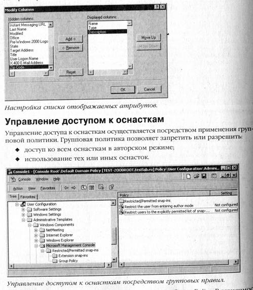 МОДИФИКАЦИЯ ОСНАСТОК Вы можете изменить условия просмотра оснастки. При выборе в меню View ко манды Customize появится диалоговое окно: В этом окне есть следующие флажки. ♦ Console tree (Дерево консоли). Это дерево расположено в левой части окна консоли. Отображать это дерево иногда нежелательно. Допустим, Вы наделили пользователя узкими административными правами: он имеет доступ лишь к одной конечной ветви в дереве консоли. В таком случае нет смысла отображать эту одинокую ветку. Лучше все окно консоли заполнить списком параметров в этой ветви. Standard Menus (Action and View) (Стандартные меню). Если в консоли, подготовленной для пользователя, стандартные меню не имеют смысла, их вывод на экран можно отключить. Standard toolbar (Стандартная панель инструментов). Если в консоли, подготовленной для пользователя, стандартные кнопки на панели инструментов не имеют смысла, их вывод на экран можно отключить. Status bar (Панель состояния) — располагается в нижней части окна панели. Отображает текущее состояние оснастки (например, Loading — загрузка). Description bar (Панель описания) — находится в правой части окна консоли над названиями столбцов в списке параметров. Taskpad navigation tabs (Вкладки панелей заданий). Если все задания умещаются на одной панели заданий, названия вкладок можно не показывать. Для оснастки, загруженной в панель, можно запретить использование как контекстных меню (флажок Menus), так и панелей инструментов (флажок Toolbars). Эти флажки расположены обособленно в рамке Snap-ins. Можно настроить и каждое конкретное окно для любой из ветвей дерева объекта Например, при просмотре списка пользователей в оснастке Active Directory Users and Computers для каждого пользователя показываются только имя, тип и описание, хотя дополнительно Вы можете вывести на экран такие параметры как фамилию, имя регистрации, должность, адрес и т. п. (т. е. большинство обязательных и некоторые необязательные атрибуты). Чтобы настроить список просматриваемых атрибутов, надо в меню View выделить команду Select columns, а в появившемся диалоговом окне выбрать нужные. Списки доступных всегда будут содержать имена только тех атрибутов, которые применимы к выбранному типу объектов. Управление доступа к оснасткам осуществляется посредством применения групповой политики. Групповая политика позволяет - запретить или разрешить доступ ко всем оснасткам в авторском режиме - использование тех или иных оснасток