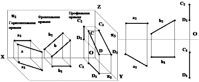 Прямая линия вполне определена двумя своими точками (не совпадающими). Проекциями прямой линии в общем случае являются также прямые линии (рис. 4.1).