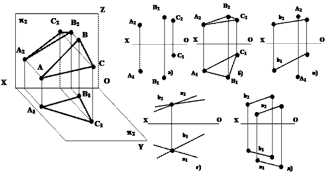 Прямая принадлежит плоскости, если: а) имеет, по крайней мере, две общие с плоскостью точки (прямая b, рис.5.3); б) когда она имеет одну общую точку и параллельна какой-либо прямой в этой плоскости (прямая aêê(BC), рис.5.3).