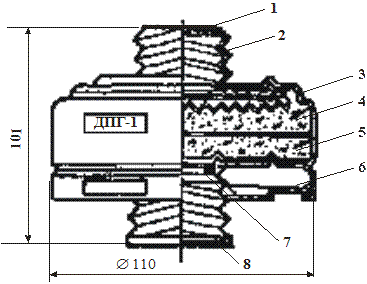 1 – прокладка гумова; 2 – ковпачок; 3 – корпус;4 – гопкаліт; 5 поглинач; 6 – дно; 7 – кільце прокладочне; 8 – заглушка Рисунок 5.10 – Додатковий патрон ДПГ – 1