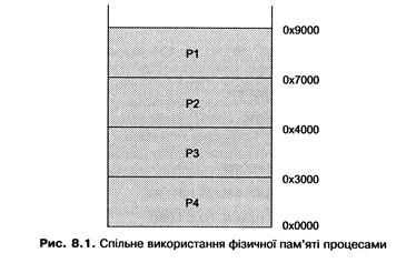 Найпростіший з можливих способів спільного використання фізичної пам'яті кількома процесами це неперервний і послідовний її розподіл між усіма виконуваними програмами (рис. 8.1).
