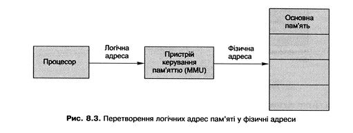 Найважливішими поняттями концепції віртуальної пам'яті є логічна і фізична адресація пам'яті. Логічна або віртуальна адреса - адреса, яку генерує програма, запущена на деякому процесорі. Адреси, що використовують інструкції конкретного процесора, є логічними адресами. Сукупність логічних адрес становить логічний адресний простір. Фізична адреса - адреса, якою оперує мікросхема пам'яті. Прикладна програма в сучасних комп'ютерах ніколи не має справи з фізичними адресами. Спеціальний апаратний пристрій MMU (memory management unit - пристрій керування пам'яттю) відповідає за перетворення логічних адрес у фізичні. Сукупність усіх доступних фізичних адрес становить фізичний адресний простір. Отже, якщо в комп'ютері є мікросхеми на 128 Мбайт пам'яті, то саме такий обсяг пам'яті адресують фізично. Логічно зазвичай адресують значно більше пам'яті. Найпростіша схема перетворення адрес зображена на рис. 8.3.