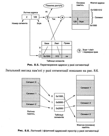Сегментація пам'яті дає змогу зображати логічний адресний простір як сукупність незалежних блоків змінної довжини, які називають сегментами. Кожний сегмент містить дані одного призначення, наприклад в одному може бути стек, в іншому - програмний код і т. д. У кожного сегмента є ім'я і довжина (для зручності реалізації поряд з іменами використовують номери). Логічна адреса складається з номера сегмента і зсуву всередині сегмента; з такими адресами працює прикладна програма. Компілятори часто створюють окремі сегменти для різних даних програми (сегмент коду, сегмент даних, сегмент стека). Під час завантаження програми у пам'ять створюють таблицю дескрипторів сегментів процесу, кожний елемент якої відповідає одному сегменту і складається із базової адреси, значення межі та прав доступу. Під час формування адреси її сегментна частина вказує на відповідний елемент таблиці дескрипторів сегментів процесу. Якщо зсув більший, ніж задане значення межі (або якщо права доступу процесу не відповідають правам, заданим для сегмента), то апаратне забезпечення генерує помилку. Коли ж усе гаразд, сума бази і зсуву в разі чистої сегментації дасть у результаті фізичну адресу в основній пам'яті. Якщо сегмент вивантажений на диск, спроба доступу до нього спричиняє його завантаження з диска в основну пам'ять. У підсумку кожному сегменту відповідає неперервний блок пам'яті такої самої довжини, що перебуває в довільному місці фізичної пам'яті або на диску. Загальний підхід до перетворення адреси у разі сегментації показаний на рис. 8.5.
