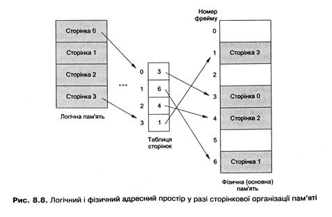 3. До основних технологій реалізації віртуальної пам'яті крім сегментації належить сторінкова організація пам'яті (paging). її головна ідея - розподіл пам'яті блоками фіксованої довжини. Такі блоки називають сторінками. Ця технологія є найпоширенішим підходом до реалізації віртуальної пам'яті в сучасних операційних системах. У разі сторінкової організації пам'яті логічну адресу називають також лінійною, або віртуальною, адресою. Такі адреси належать одній множині (наприклад, лінійною адресою може бути невід'ємне ціле число довжиною 32 біти). Фізичну пам'ять розбивають на блоки фіксованої довжини - фрейми, або сторінкові блоки (frames). Логічну пам'ять, у свою чергу, розбивають на блоки такої самої довжини -сторінки (pages). Коли процес починає виконуватися, його сторінки завантажуються в доступні фрейми фізичної пам'яті з диска або іншого носія. Сторінкова організація пам'яті повинна мати апаратну підтримку. Кожна адреса, яку генерує процесор, ділиться на дві частини: номер сторінки і зсув сторінки. Номер сторінки використовують як індекс у таблиці сторінок. Таблиця сторінок - це структура даних, що містить набір елементів (page-table entries, PTE), кожен із яких містить інформацію про номер сторінки, номер відповідного їй фрейму фізичної пам'яті (або беспосередньо його базову адресу) та права доступу. Номер сторінки використовують для пошуку елемента в таблиці. Після його знаходження до базової адреси відповідного фрейму додають зсув сторінки, чим і визначають фізичну адресу (рис. 8.7).