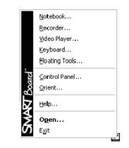 Увага! Інструментарій SMART boards Програмне забезпечення SMART board Програмне забезпечення SMART board працює на рівні драйверів у фоновому режимі. Якщо воно інстальоване, то починає працювати відразу ж після будь-якого дотику до активної поверхні дошки. Ви можете повністю управляти комп'ютером з поверхні самої дошки, для цього потрібно тільки встановити на програмне забезпечення SMART Board. Крім цього ви можете використовувати клавіші Pen Tray для емуляції правої клавіші миші або активізації клавіатури SMART. Після будь-якого запуску комп'ютера, підключена до нього дошка автоматично стає сенсорною. Порада: Використовуйте екранну клавіатуру для реєстрації комп'ютера ще до того, як інструментарій SMART board стає доступним. Для цього при появі вікна реєстрації натисніть клавішу Keyboard на Pen Tray. На екран буде виведена екранна клавіатура і ви можете з неї ввести ім'я користувача і пароль. Цей інструментарій пропонує повний обсяг функцій SMART Board понад того, що передбачається при використанні сенсорного управління і клавіш Pen Tray. Доступ до інструментарію здійснюється клацанням по іконі SMART board на панелі задач. Інструментарій SMART Board повинен бути активізований для використання пера і гумки Pen Tray. Іншими словами, якщо ви збираєтеся писати на інтерактивній дошці, то переконаєтеся в тому, що іконка SMART Board з'явилася на панелі задач. Для ОС Windows цей інструментарій доступний зі спливаючого меню команд, і активізується клацанням по іконі SMART Board, яка з'являється в системному рядку