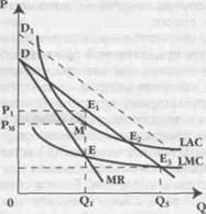 Рис. 7.8. Потери от несовершенной конкуренции полия как бы «рвет на части» излишек потребителя и излишек производителя: часть достается (затененный прямоугольник) самой монополии, а другая часть этого излишка потребителя в виде площади СЕ,Е2 вообще теряется обществом, не достается никому. Так же не достается никому часть излишка производителя (треугольник ЕСЕУ), это недополученное, а точнее, разрушенное богатство общества. По некоторым подсчетам, «мертвый убыток», возникающий в силу монополистического распределения ресурсов, составляет 0,5-2% валового национального продукта США. § 5. Естественная монополия В некоторых отраслях экономики наиболее эффективна организация производства на базе единственной фирмы, а не нескольких фирм-конкурентов, т. е. производство любого объема продукции в рамках одной фирмы обходится дешевле, чем в нескольких. Эта эффективность обусловлена особой значимостью для таких отраслей роста масштаба производства, когда долгосрочные средние издержки производителя (long run average cost, LAC) достигают своего минимума и продолжают сохраняться на низком уровне в течение длительного времени вместе с ростом объема выпускаемой продукции. Чем выше объем выпуска продукции, тем ниже средние издержки, при этом предельные издержки ниже средних при всех уровнях объемах производства. В графическом изображении средние издержки такой фирмы имеют не параболическую (Сообразную), а /.-образную кривую (рис. 7.9).