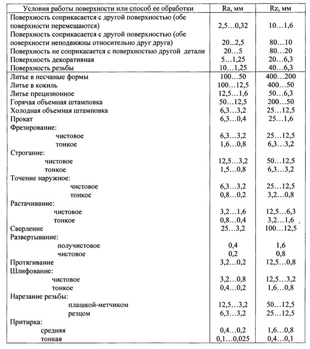 З. Принять решение по составу изображений, исходя из условия, что их количество должно быть минимальным, но достаточным для уяснения формы и размеров детали. 4. Установить стандартный масштаб изображений из расчета их размещения на листе формата АЗ и более. для малогабаритных и сложных по форме деталей масштаб изображений должен быть более крупным. Выносные элементы следует выполнять в масштабах 4:1 или 5:1. 5. Выбрать и заготовить формат листа чертежной бумаги. Оформить рабочее поле чертежа в тонких линиях: нанести карандашом Т или 2Т рамку формата, контуры основной надписи и дополнительной графы. Произвести компоновку листа, т. е. принять решение по расположению изображений на листе, оставляя место над основной надписью для написания технических требований. Следует помнить, что рабочее поле чертежа с учетом масштабов изображений должно быть занято на 70... 80 %. 6. Вычертить тонкими линиями все необходимые изображения-виды, разрезы, сечения, выносные элементы. Вычерчивание следует начинать с осевых линий, а изображения выполнять одновременно, переходя от одного изображения к другому и постепенно формируя конструктивные элементы детали. Деталь необходимо вычерчивать в состоянии до сборки, т. е. до выполнения технологических сборочных операций, связанных с запрессовкой, обжатием, развальцовыванием, расклепыванием, совместным сверлением и т. п. Части и элементы детали, показанные на чертеже общего вида упрощенно, условно или не показанные вообще (фаски, галтели, зенковки, канавки и т. п.) необходимо изобразить с конструктивными подробностями, т. е. без упрощений. Гнезда под шпильки или винты, шлицы, шпоночные пазы, центровые гнезда и т. п. должны быть вычерчены в соответствии со стандартами на эти элементы. 7. Нанести выносные и размерные (без стрелок) линии, обеспечивая минимальное количество размеров, но достаточное для определения величины изображенной детали и ее конструктивных элементов. Размеры внешних элементов следует наносить со стороны вида, а внутренних — со стороны разреза. Размеры, относящиеся к одному конструктивному элементу, необходимо группировать на одном изображении, где данный элемент изображен более полно. 8. Нанести размерные числа. Величины размерных чисел следует определять путем обмера детали на чертеже общего вида масштабной линейкой и циркулем-измерителем с обязательным учетом действительного масштаба изображений и стандартов на ряды линейных и угловых размеров (ГОСТ 6639—69; ГОСТ 8908—8 1). Размеры сопрягаемых поверхностей должны быть согласованы с размерами сопрягаемых деталей. Часть размеров может быть выяснена по таблице на чертеже общего вида (например, типы и размеры резьб). Размеры стандартных конструктивных элементов (шпоночных пазов, шлицев, гнезд под установочные и крепежные винты и шпильки, центровых отверстий, канавок и др.) необходимо взять из стандартов на эти элементы. 9. Нанести обозначения шероховатости поверхностей. Величины параметров шероховатости Rz или Rа (Rа предпочтительнее) задаются в зависимости от функционального назначения и условий работы поверхностей, либо от способа их образования (таблица 2.7). Конкретные величины параметров шероховатости в установленных диапазонах их значений необходимо скорректировать по табл. 2.8 10. Вычертить и заполнить тонкими линиями графы основной 