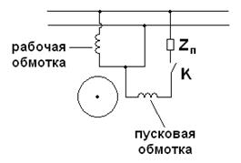 Рассмотрим электрическую схему однофазного асинхронного двигателя с одной обмоткой на статоре. Однофазный асинхронный двигатель – это асинхронный двигатель, подключенный к однофазной сети переменного тока. Конструкция совпадает с конструкцией трехфазного асинхронного двигателя с короткозамкнутым ротором. Такой асинхронный двигатель вращающегося магнитного поля не создает, так как отсутствует пространственный и временной сдвиг. Для создания вращающегося магнитного поля однофазный асинхронный двигатель снабжают наряду с рабочей обмоткой пусковой обмоткой, которая имеет пространственный сдвиг относительно рабочей обмотки на 90° (рис. 14.3). Кроме того, однофазный асинхронный двигатель имеет фазосдвигающие элементы zп, роль которых могут играть сопротивление R, индуктивность L, емкость С. Наиболее часто в качестве фазосдвигающего элемента zп используют емкость. Такие двигатели называются конденсаторными однофазными двигателями. В момент пуска ключ К замкнут, и механическая характеристика, соответствующая асинхронному двигателю (рис. 14.3), имеет следующий вид (рис. 14.2).