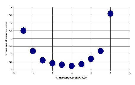 У останньому стовпчику таблиці 4 обчислені теоретичні значення результатів спортсмена (значення вирівнювальної функції Для наочності побудуємо (рис. 3) в одній системі координат графік функції (5) та емпіричний точковий графік. Функцію (5) можна використовувати для підвищення ефективності планування тренувального процесу. Так, наприклад, за її допомогою можна обчислити оптимальну тривалість тренування та ряд інших важливих показників.