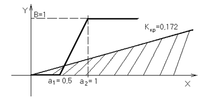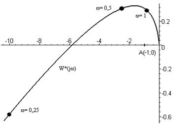 Если нелинейность впишется в угол, образованный осью ОХ и линией 0,172х=y, то САУ будет устойчива. В нашем случае нелинейность не вписывается в этот угол, значит, при заданной нелинейности и заданных параметрах линейной части она абсолютно неустойчива. В нашем случае нелинейность не вписывается в этот угол, значит, при заданной нелинейности и заданных параметрах линейной части она абсолютно неустойчива.