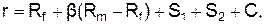 де r – ставка дисконту (доходу на власний капітал); Rf – норма доходу по безризикових вкладеннях; b – коефіцієнт бета (захід систематичного ризику, тобто ризику, пов'язаного з макроекономічними й політичними процесами, що відбуваються в країні); Rm – загальна прибутковість ринку в цілому; S1 – додаткова норма доходу за ризик інвестування в конкретну компанію (несистематичні ризики); S2 – додаткова норма доходу за ризик інвестування в малу компанію; C – додаткова норма доходу, що враховує рівень странового ризику.