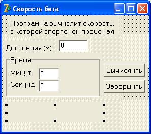 Разработать приложение, которое вычисляет скорость (км/час), с которой спортсмен пробежал дистанцию. Рекомендуемый вид формы приведен на рисунке. Количество минут задается целым числом, секунд – вещественным.