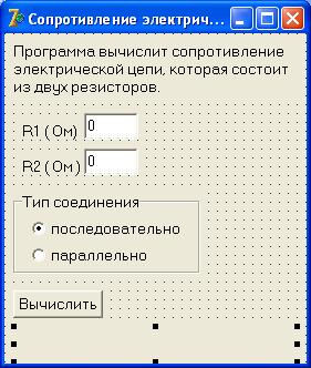 Разработать приложение для вычисления сопротивления электрической цепи, состоящей из двух сопротивлений. Сопротивления могут быть соединены последовательно или параллельно. Рекомендуемый вид формы приведен на рисунке. Если величина сопротивления цепи превышает 1 000 Ом, то результат должен быть выведен в килоомах.