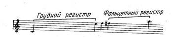 У необученных певцов голос имеет регистровое строение, то есть звучит на разных участках диапазона по-разному. Если предложить необученному певцу спеть снизу доверху весь звукоряд, имеющийся в распоряжении его голоса, то, подходя к определенным звукам, певец чувствует неудобство, неуверенность, после чего голос вновь легко идет вверх, — но уже с другой окраской, другим характером. Он начинает звучать в другом регистре. Переход от одного характера звучания к другому, т. е. перемена регистра, не только сопровождается тембровыми изменениями, но и ясно ощущается самим певцом, ибо его голосовой аппарат начинает работать иначе, по другому принципу. Происходит смена механизма, которым извлекается звук. Изменению тембра звука сопутствует перемена в работе голосовых органов. Под регистром певческого голоса понимается ряд однородно звучащих звуков, выполненных единым физиологическим механизмом. Вследствие различного анатомического строения и разных функциональных возможностей мужской и женской гортани, регистровое строение мужского и женского голосов тоже разное. Мужской голос имеет два основных регистра (грудной и фальцетный) и один переход. Женские голоса имеют три регистра (грудной, центр и головной) и соответственно два перехода. Многие педагоги различают в голосе больше регистров. Однако есть и такие, которые вовсе отрицают их наличие, считая что регистры — результат неверного пользования голосовым аппаратом. Редко, но встречаются такие голоса, которые без заметного изменения в тем-бре, могут спеть весь диапазон ровным, однородным звуком, не учась этому специально.