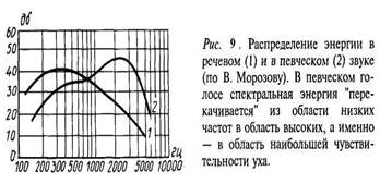 Однако тембр может быть сформирован совсем по-другому, так что основная энергия будет содержаться в высоких обертонах, в области высокой певческой форманты. Этот звук с иным по спектру распределением энергии для слушателя будет неизмеримо более громким, поскольку основная часть энергии будет восприниматься самой чувствительной зоной уха. В поставленном голосе, в хорошо оформленном певческом тембре энергия всегда распределена так, что примерно 30% ее сосредоточено в области высокой певческой форманты. Так достигается хорошая полетность. Построение спектра с максимальной концентрацией энергии в области высоких частот — важнейшее физиологическое приспособление голосового аппарата для получения максимальной слышимости при минимальной затрате энергии, что в практике называется высокой позицией звука. Это хорошо знают вокальные педагоги, работающие главным образом над формированием тембра голоса, над высокой позицией звука, а не над выработкой его силы.