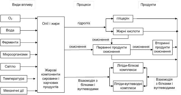 Глибина і інтенсивність цих процесів залежать від хімічного складу ліпідів, характеру супутніх речовин (антиоксидантів, меланоідинів), вологості, присутності мікроорганізмів, активності ферментів, контакту з киснем, від способів упаковки жиру і ряду інших факторів. При неправильному зберіганні вершкового,топленого коров’ячого масла, маргарину поверхня їх змінює колір, а за смаком і запахом ці жири стають схожими на сало. Результатом цих перетворень є зменшеня вмісту гідро пероксидів у жирах і поява таких вторинних продуктів самоокиснення, як альдегіди (альдегідне прогоркання), кетони (кетонне прогоркання), оксикислоти (засалювання). Прогорклі жири стають непридатними до використання у їжу із-за неприємного пекучого смаку і запаху. Найлегше прогоркають жири багаті ненасиченими жирними кислотами, а яловичий, баранячий і гідрогенізовані жири менше прогоркають. Завдяки низькій вологості, відсутністі мінеральних речовин ліпіди не вражаються мікроорганізмами і можуть тривалий час зберігатися у темному місці. Оптимальні умови для зберігання: температура 4-6 оС, відносна вологість повітря 75%. В побуті їх слід зберігати в закритій скляній тарі у темряві.