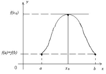 Теорема 4 (теорема Ролля) Если функция f (x) определена на [ a; b ] и выполнены следующие условия: 1. f (x) непрерывна на [ a; b ]; 2. f (x) дифференцируема на (a; b); 3. f (a) = f (b), то внутри этого отрезка найдется хотя бы одна точка х о, в которой выполняется равенство: f ' (хо) = 0. Доказательство. Так как f (x) непрерывна на [ a; b ], то она достигает на этом отрезке своих наименьшего m и наибольшего M значений. Возможны два случая: 1) m = M, 2) m < M. 1) Если m = M, то f (x) = const = m = M. Тогда f '(x) = 0 при любом x Î (a; b). Следовательно, в этом случае теорема верна и при этом в качестве х о можно рассматривать любое значение x Î (a; b). 2) Если m < M, то, исходя из условия f (a) = f (b), по крайней мере одно из чисел m или M не равно f (a) = f (b). Для определенности предположим, что M – наибольшее значение f (x) достигается не на концах отрезка [ a; b ], а в некоторой внутренней точке х о Î (a; b). Тогда в точке х о для приращения функции справедливо неравенство: D y = f (х о + D x) - f (х о) ≤ 0, так как f (х о) = M – наибольшее значение f (x) на [ a; b ] и D x такое, что х о + D x Î [ a; b ]. · Если D x > 0, то · Если D x < 0, то Так как по условию теоремы функция f (x) дифференцируема при x Î (a; b), то b в точке х о существует производная. Значит справедливы равенства: f ' (х о +0) = f ' (х о -0) = f ' (х о) = 0. Теорема доказана.